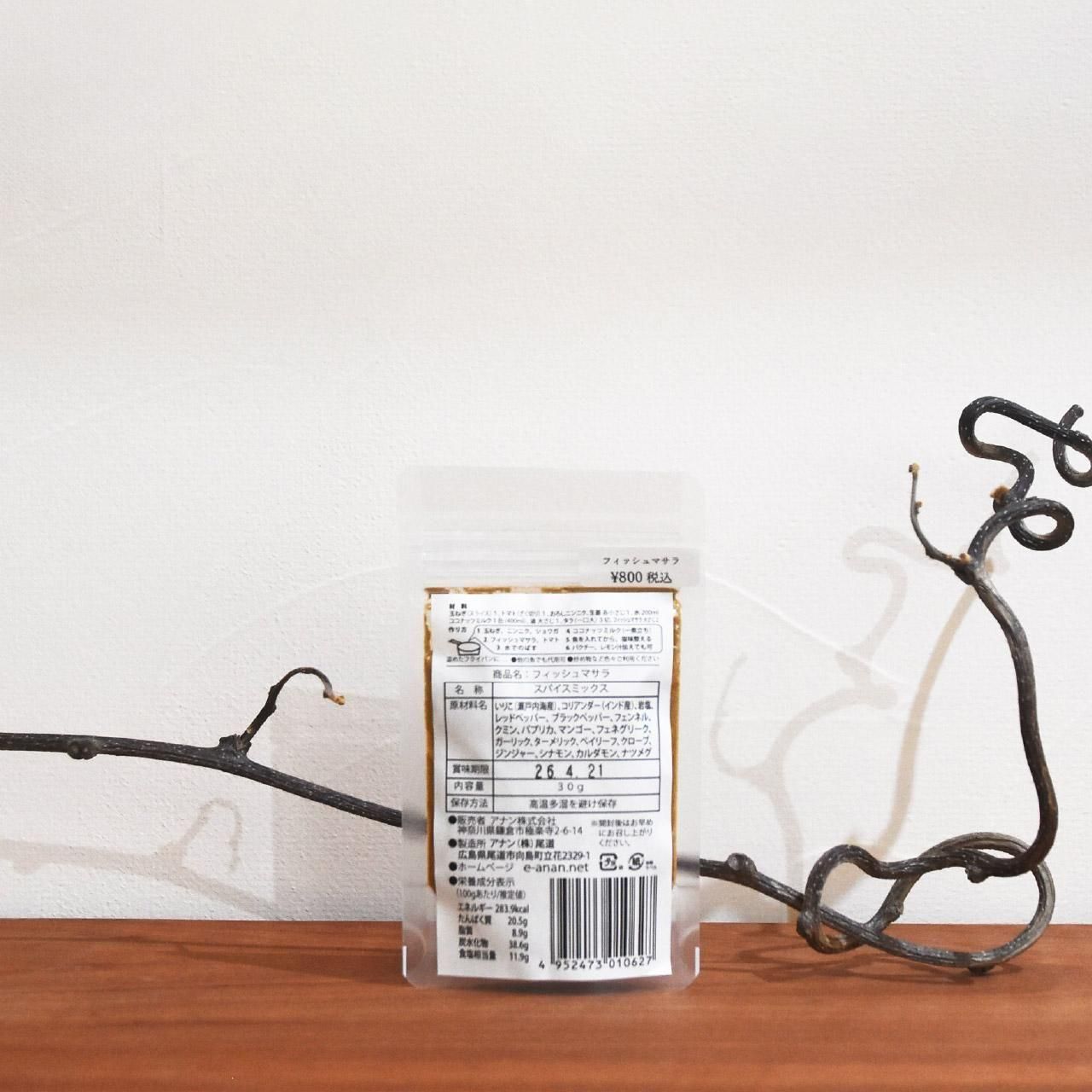 〈原材料〉いりこ(瀬戸内海産)、コリアンダー(インド産)、石塩、レッドペッパー、ブラックペッパー、フェンネル、クミン、パプリカ、マンゴー、フィネグリーク、ガーリック、ターメリック、ベイリーフ、クローブ、ジンジャー、シナモン、カルダモン、ナツメグ