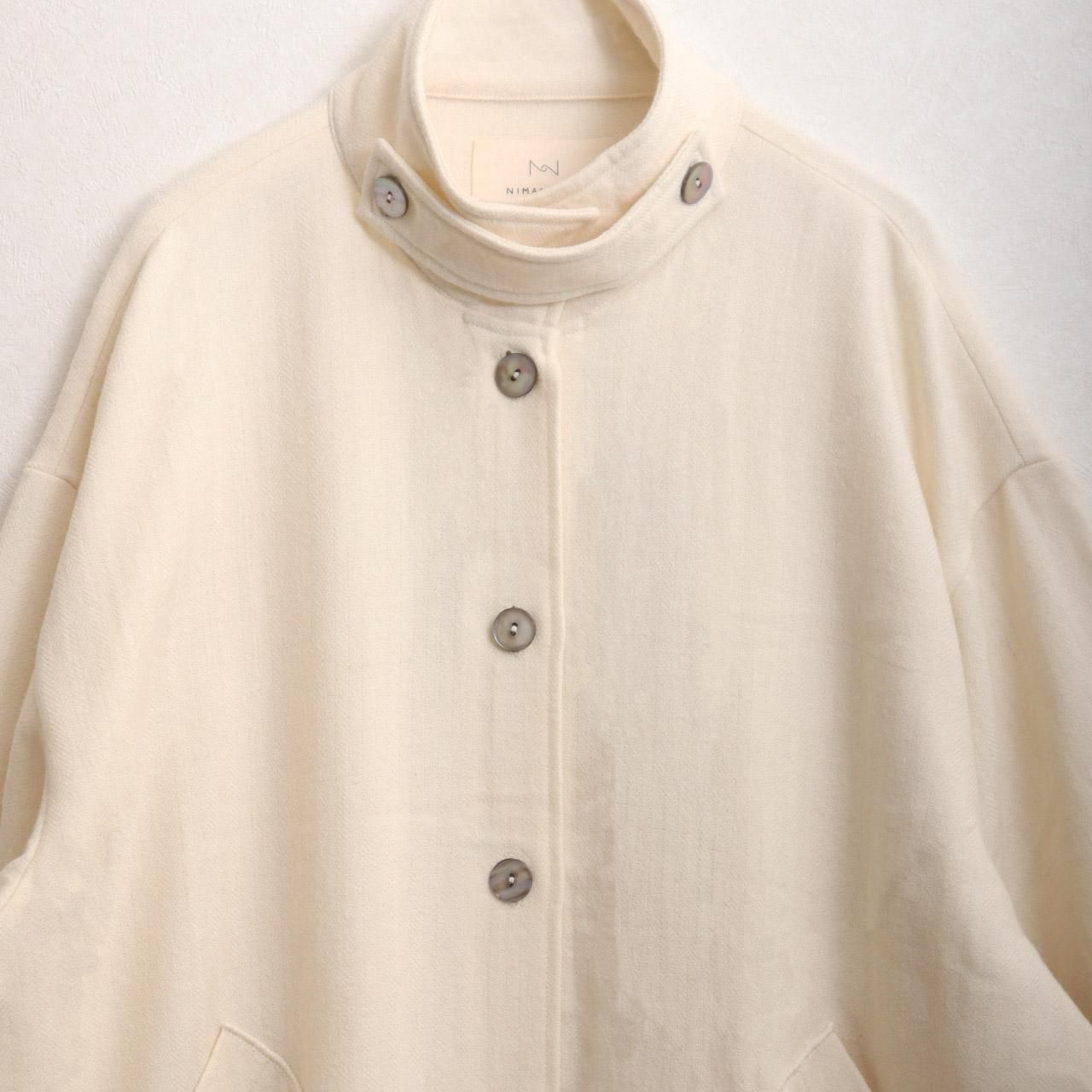 首元のベルト部分は外して、襟を倒した形や、前開きでの着用など、着方によって印象が変わる万能なジャケットです。