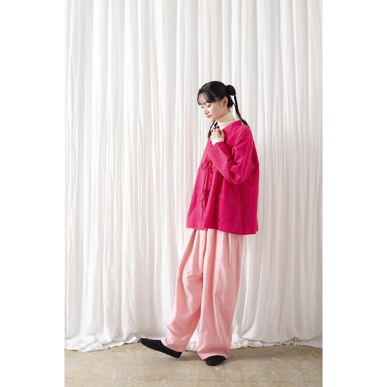 ウエストにはゴムを使用しており、着心地抜群。股下が少し長めでゆったりとしたシルエットが特徴です。