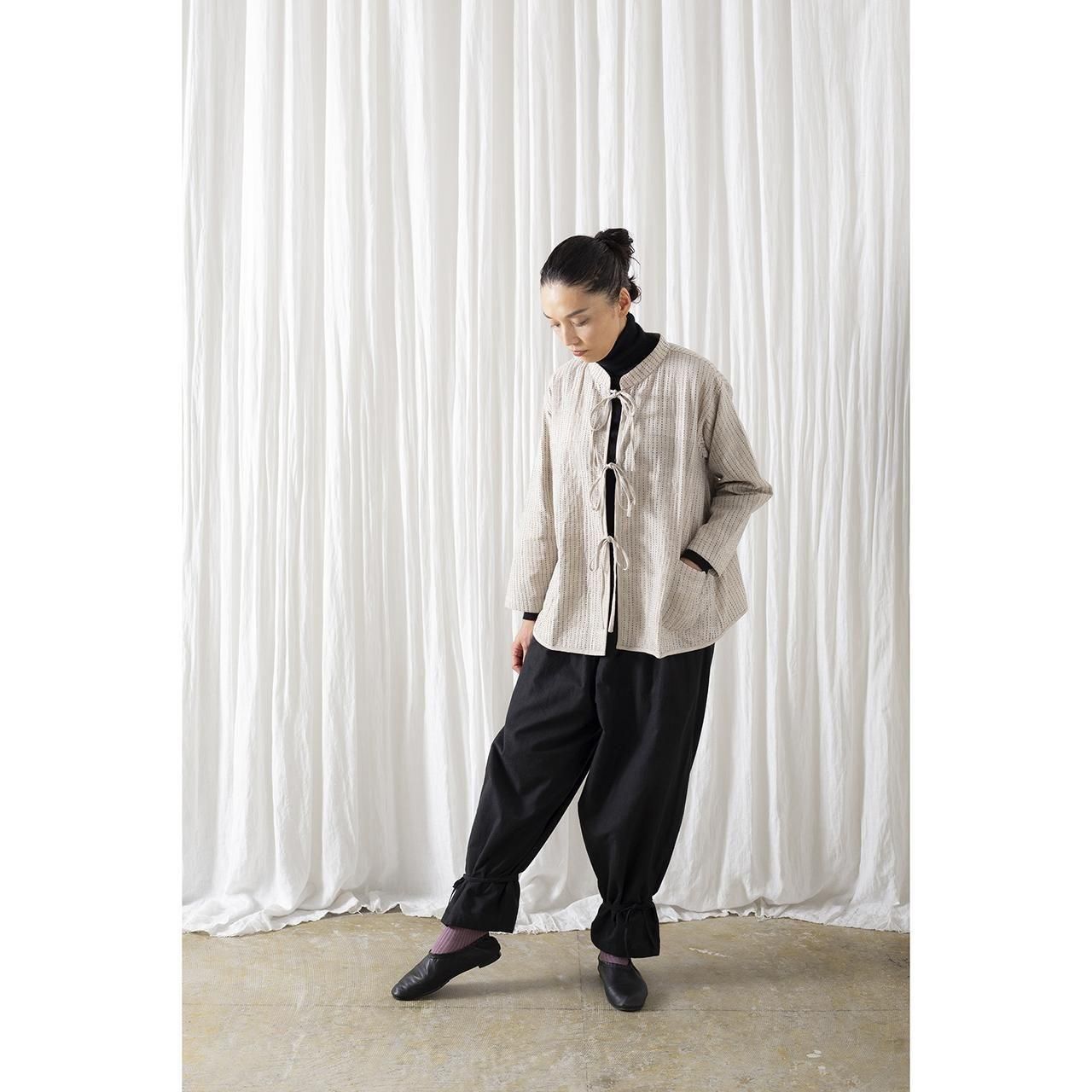 ユニセックスで着用可能なカディコットン製のパンツ、裾絞りデザインがお洒落な一着です。