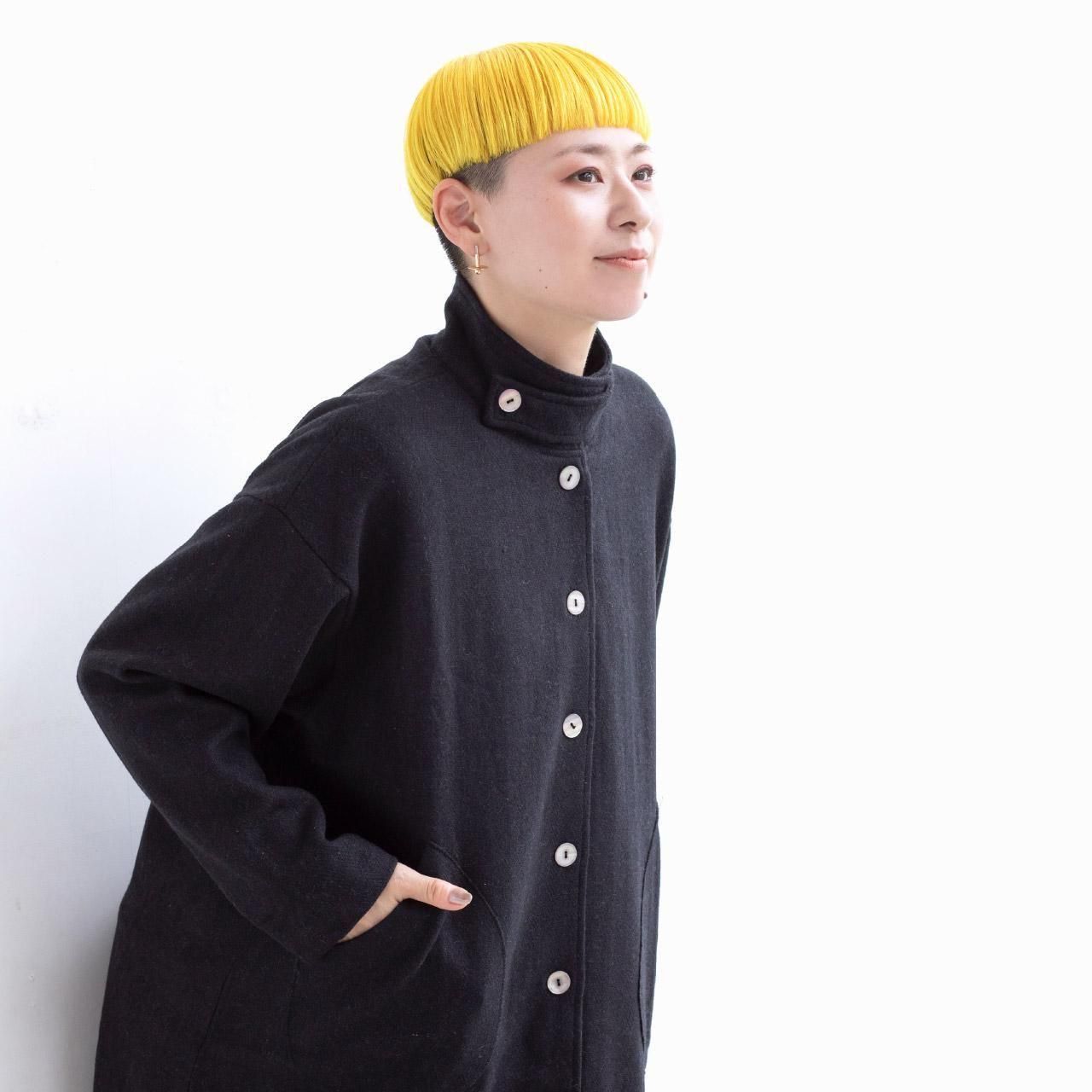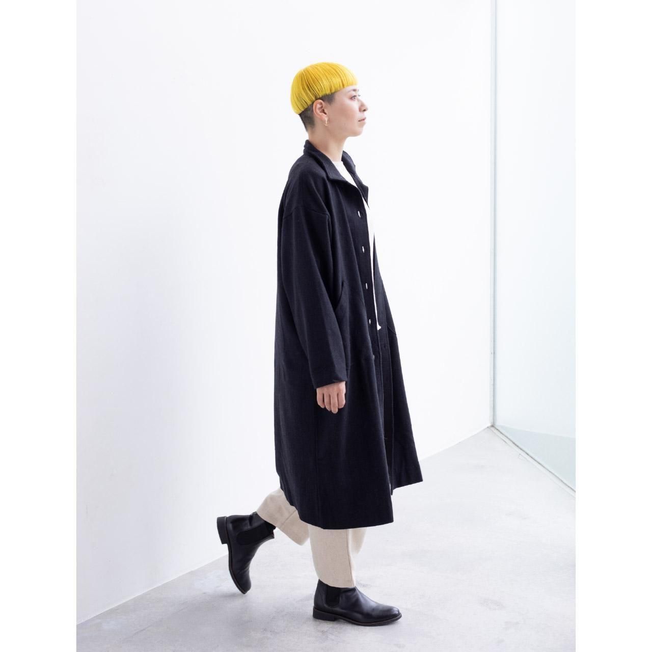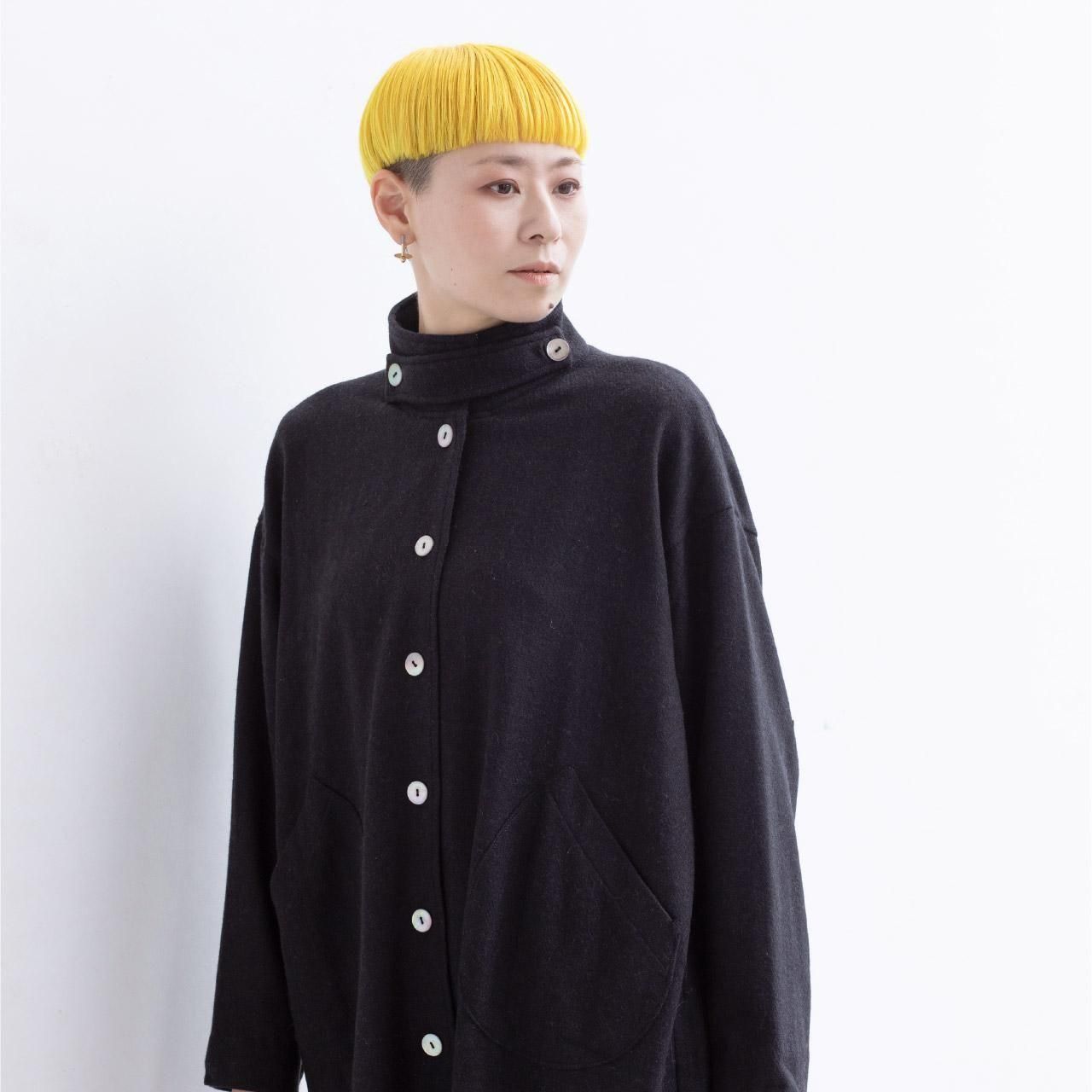 首元のベルト部分は外して、襟を倒した形や、前開きでの着用など、着方によって印象が変わる万能なジャケットです。