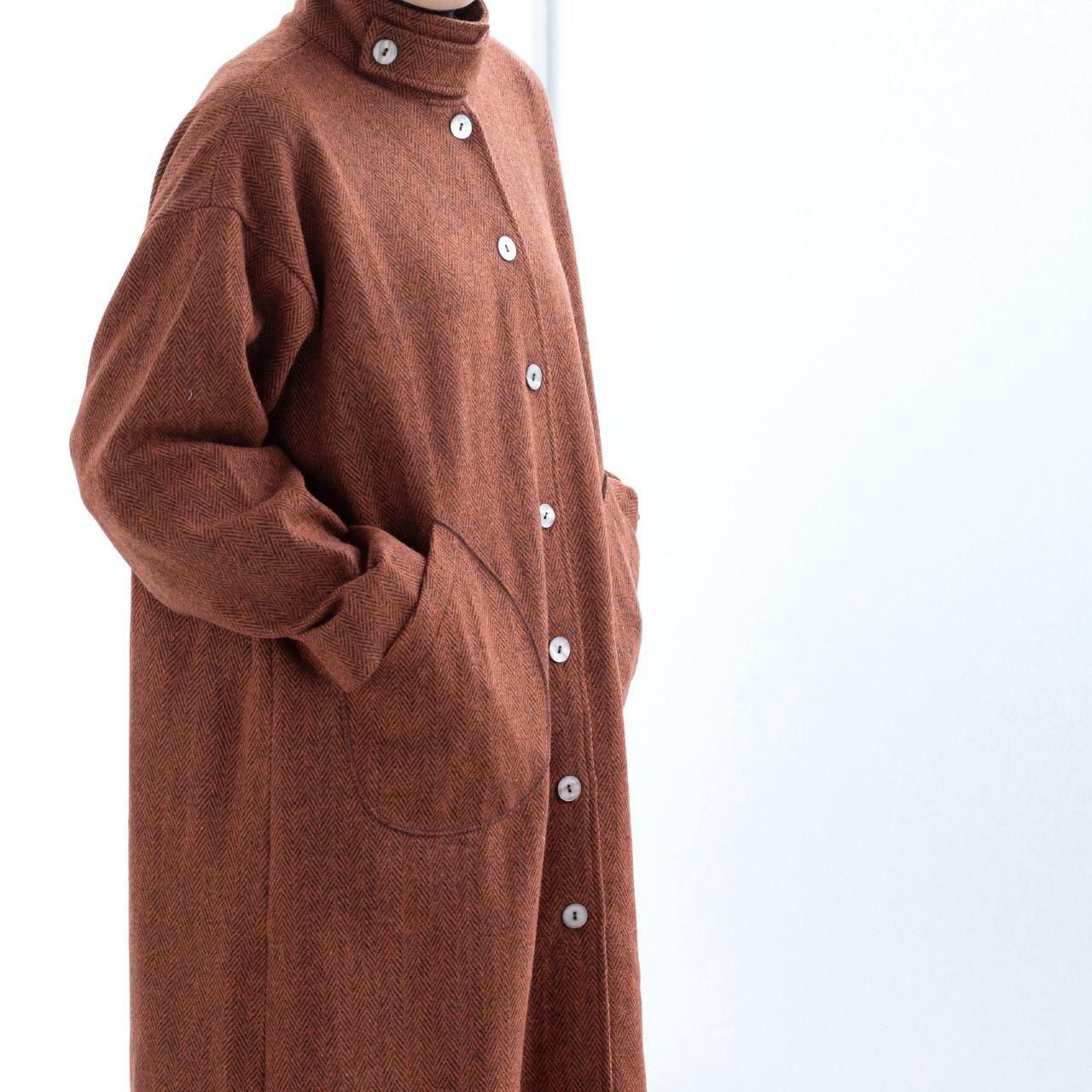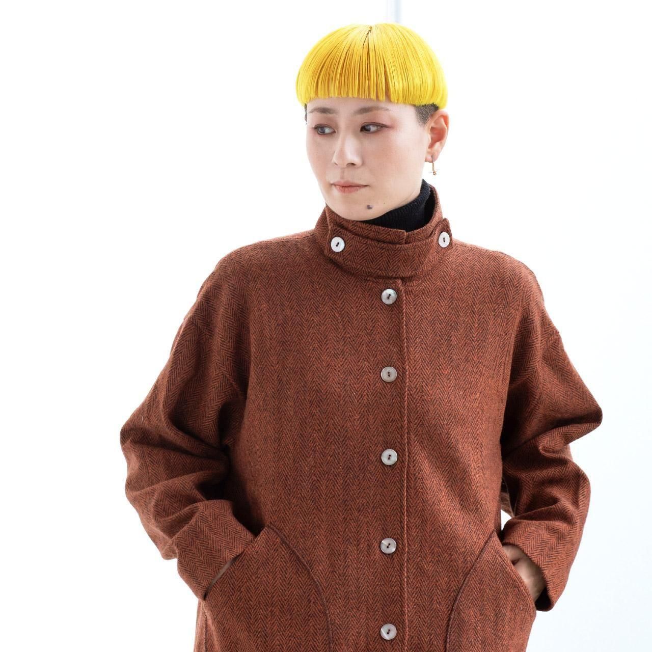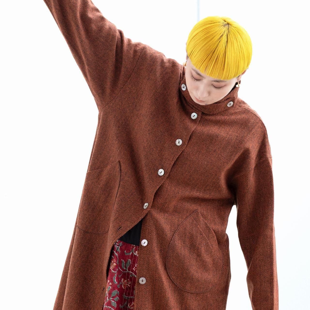 カシミール手織りウール ロングジャケット(オレンジヘリンボーン)
